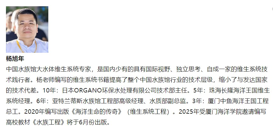 我司總工楊旭年先生接受亞州水族技術(shù)研究院的邀請(qǐng),在2025年4月15至18日出席在貴陽(yáng)舉辦的第六國(guó)際水族館交流培訓(xùn)會(huì),任《海洋館維生系統(tǒng)設(shè)計(jì)》課程講師,課程主要內(nèi)容包括:
